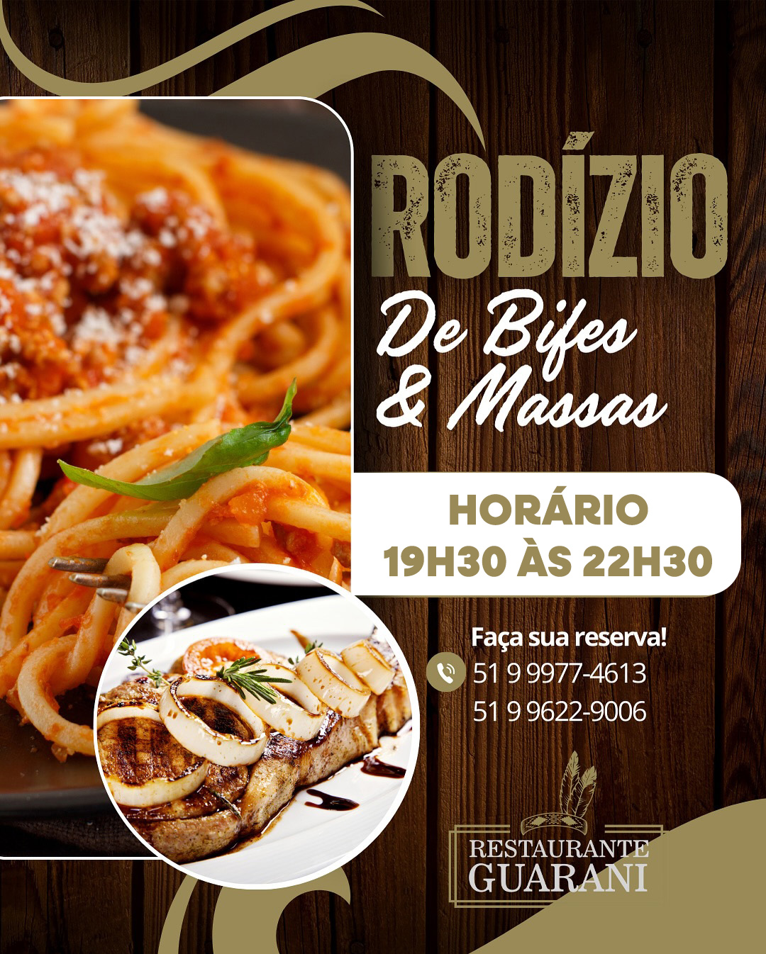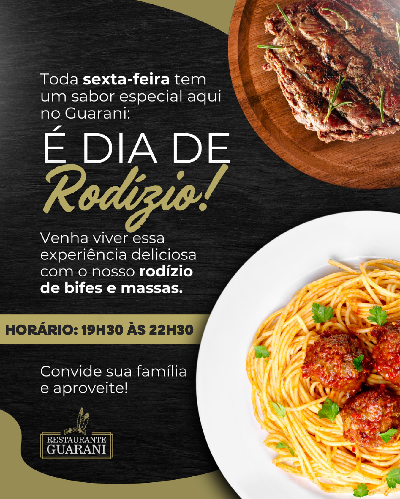 O Rodízio do Guarani acontece somente às sextas-feiras, das 19h30 às 22h e inclui: Bife de filé mignon ao molho de gorgonzola, bife à parmegiana, massa caseira ao molho de manjericão, bife de lombinho de porco ao molho de laranja, picanha, bife ao molho madeira, entre outros. Sobremesa e 1 refrigerante incluso por pessoa. Opções de bebidas: drinks, champanhe e vinhos. Valores:R$ 79,90 (Pix ou cartão) ou R$ 69,90 (dinheiro) Crianças:0 a 5 anos: não pagam e 6 a 10 anos: pagam metade Promoção de aniversário: aniversariante ganha o rodízio grátis ao trazer 10 pessoas ou mais. Reservas recomendadas apenas para grupos maiores, a fim de garantir o melhor atendimento possível. Para casais ou pequenos grupos, normalmente não é necessário reservar. Chama a família, os amigos e vem viver essa experiência! Reservas: (51) 99977-4613 ou (51) 99622-9006.